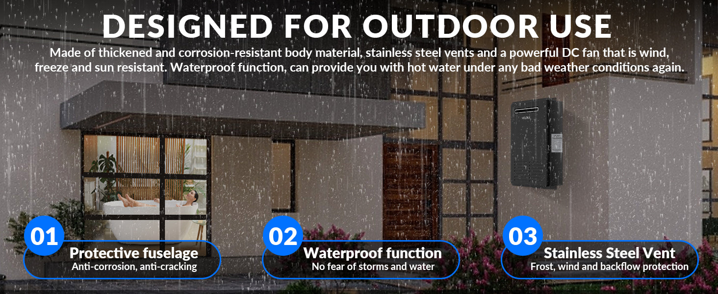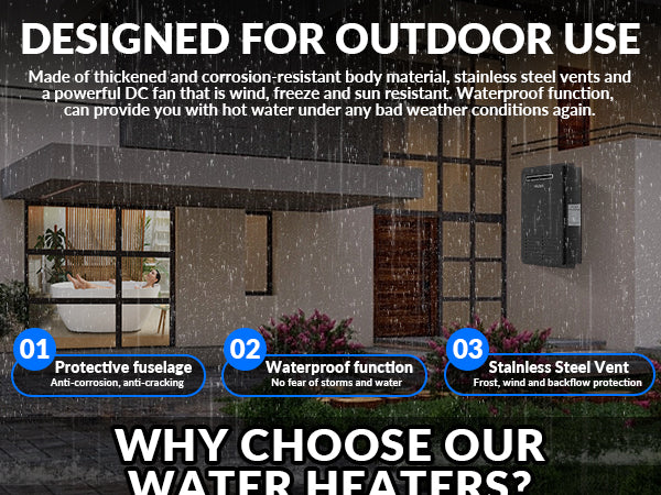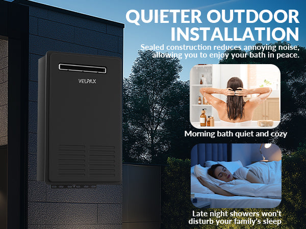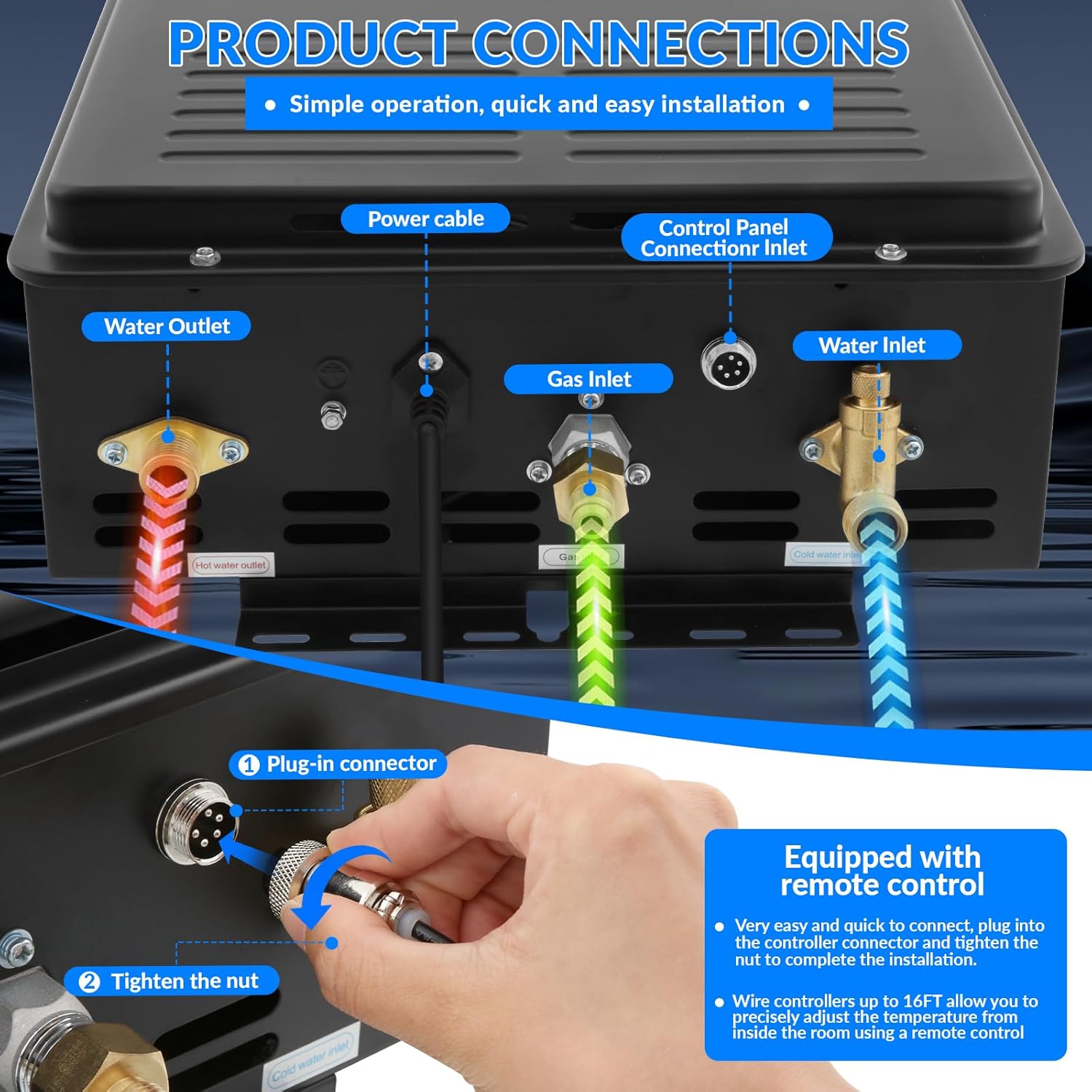 - 【Fast & Convenient Outdoor Installation】– With a space-saving design measuring 23.2" x 14.9" x 6.3", this tankless water heater is built for quick and easy outdoor setup. It includes a remote control panel for simple indoor operation and runs smoothly with low water pressure from 3.16-150 PSI. Just plug it into a standard 120V AC outlet for a reliable and hassle-free power connection.