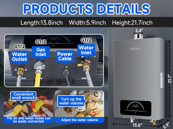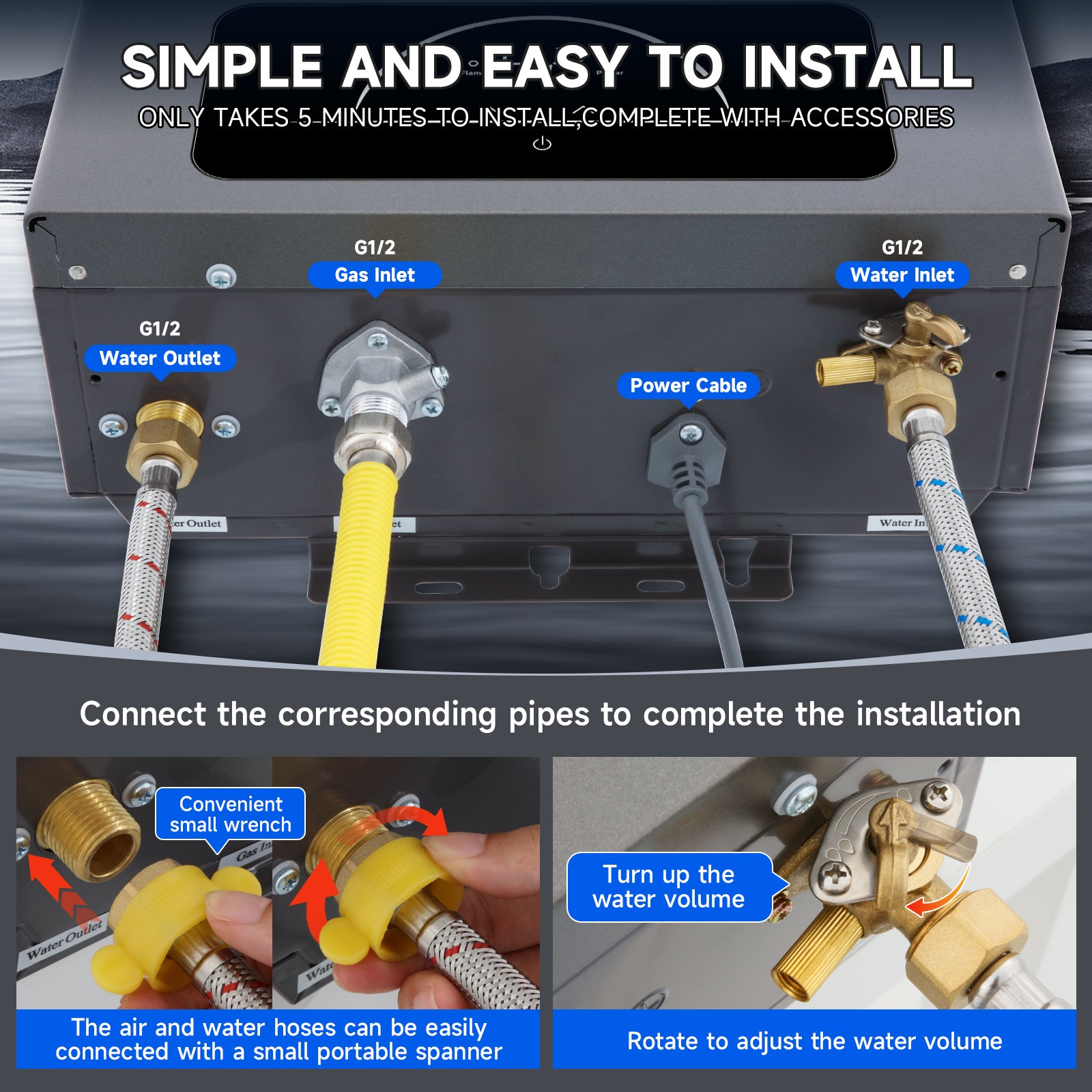 • 【Easy Installation & Use】– This tankless propane water heater is designed for quick and hassle-free setup. It comes equipped with standard 1/2" NPT water fittings, gas pipe, inlet and outlet water pipe, and a 2.5" horizontal vent pipe for easy installation. For safe operation, ensure proper ventilation and install a smoke exhaust pipe as required.