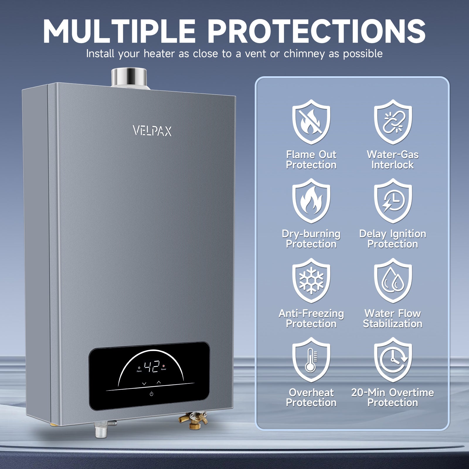 • 【Premium Quality & Durability】– Crafted with a stainless steel body for superior temperature and corrosion resistance, this propane water heater is built to last. The oxygen-free copper water tank ensures minimal heat loss and an extended service life. The LED smart digital display allows for easy temperature adjustments between 95°F and 149°F, giving you precise control over your hot water needs.