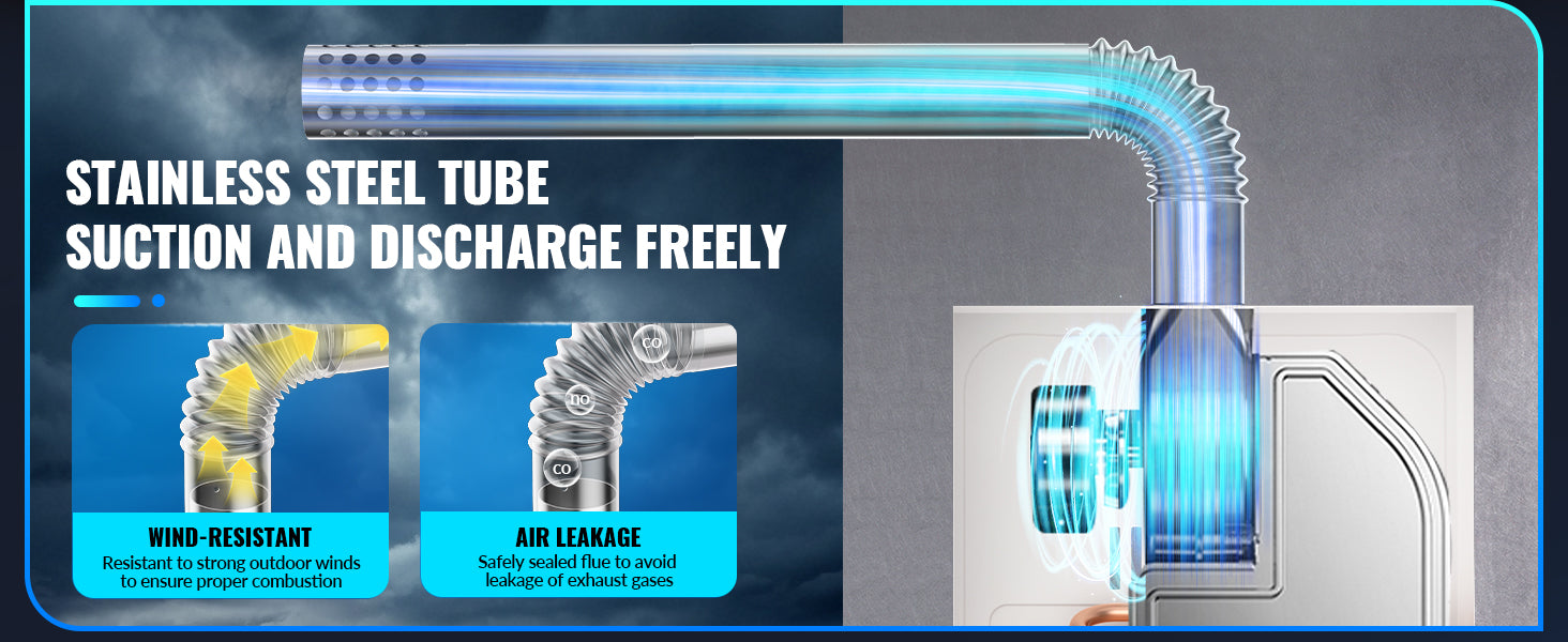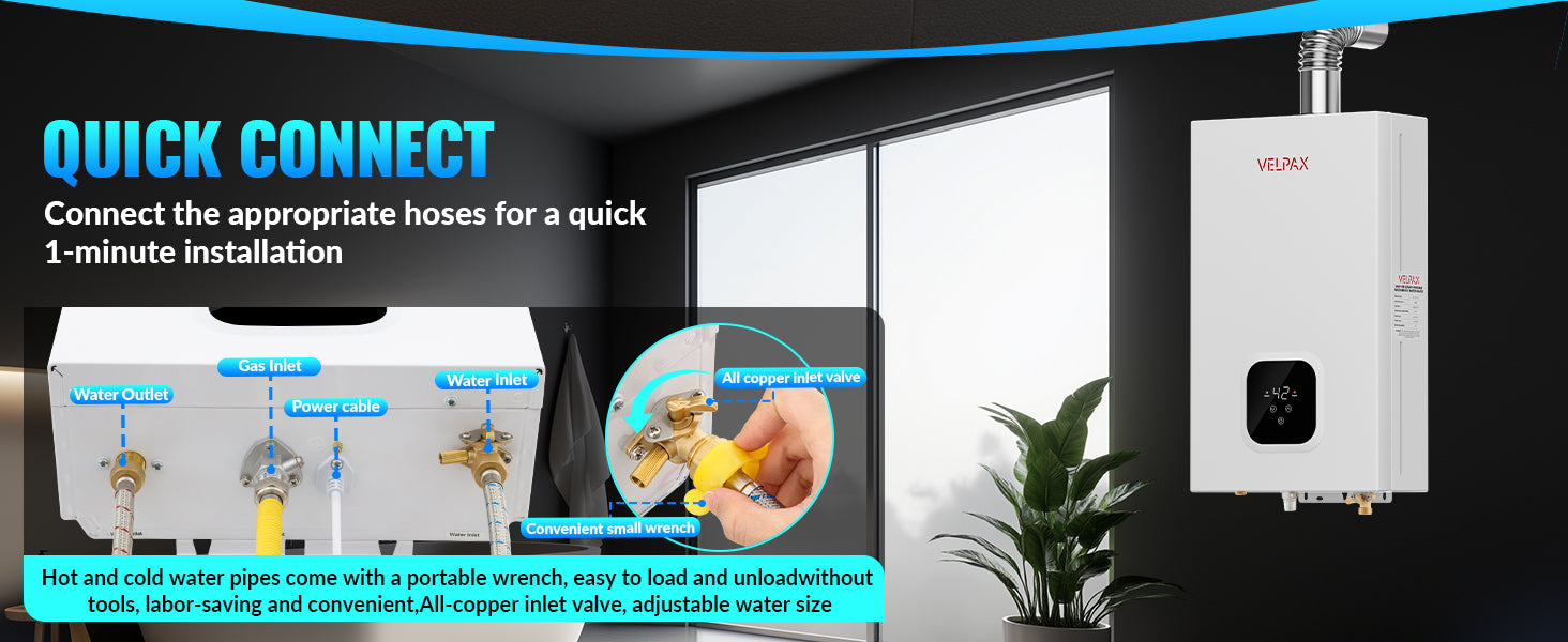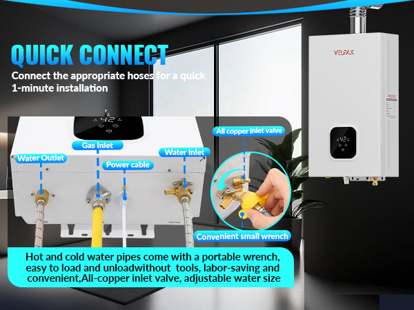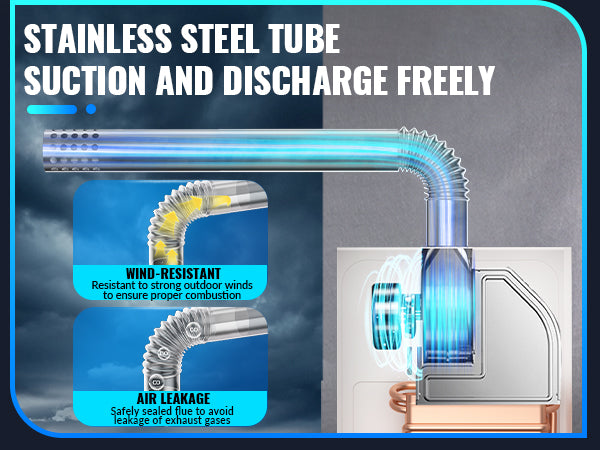 - 【Easy Installation & Use】– This tankless propane water heater is designed for quick and hassle-free setup. It comes equipped with standard 1/2" NPT water fittings,gas pipe, inlet and outlet water pipe, and a 2.5" horizontal vent pipe for easy installation.For safe operation, ensure proper ventilation and install a smoke exhaust pipe as required.