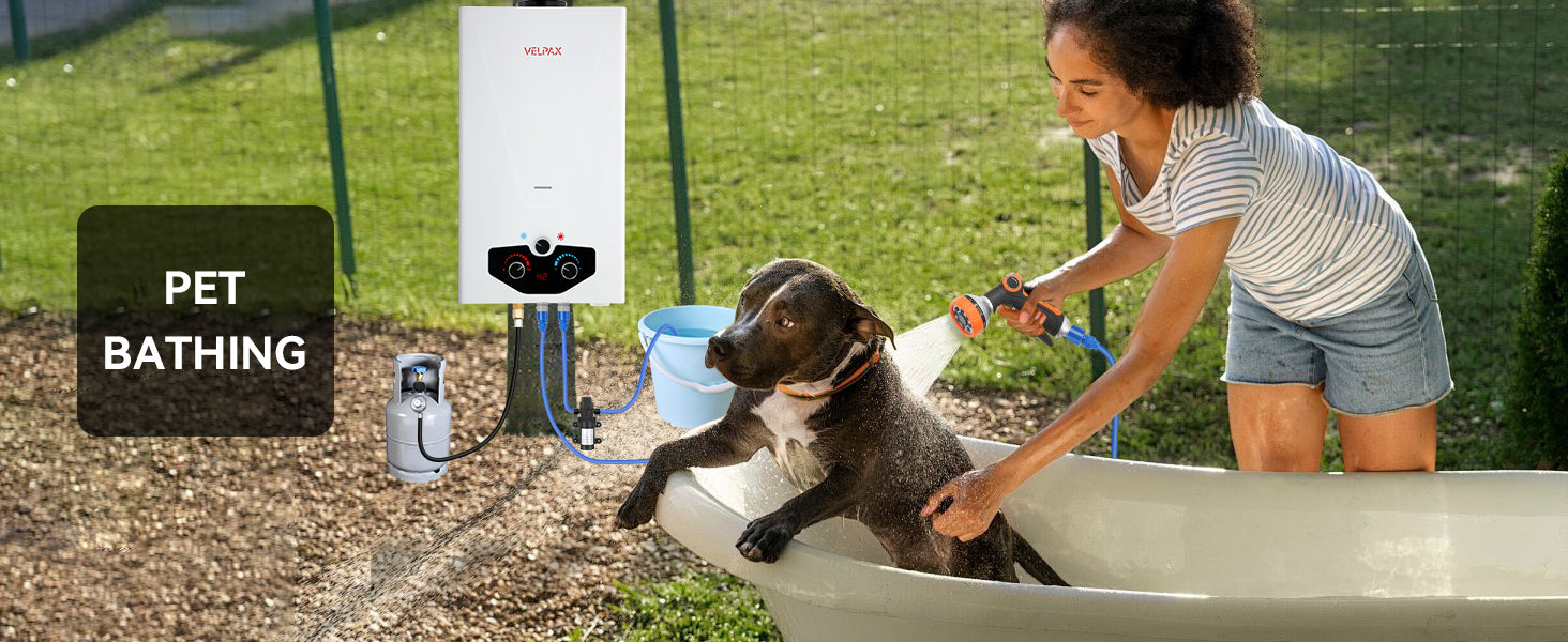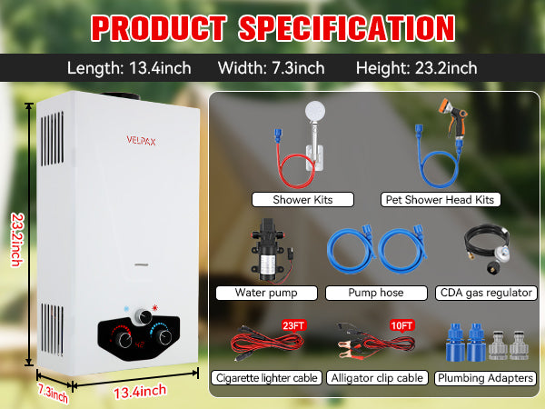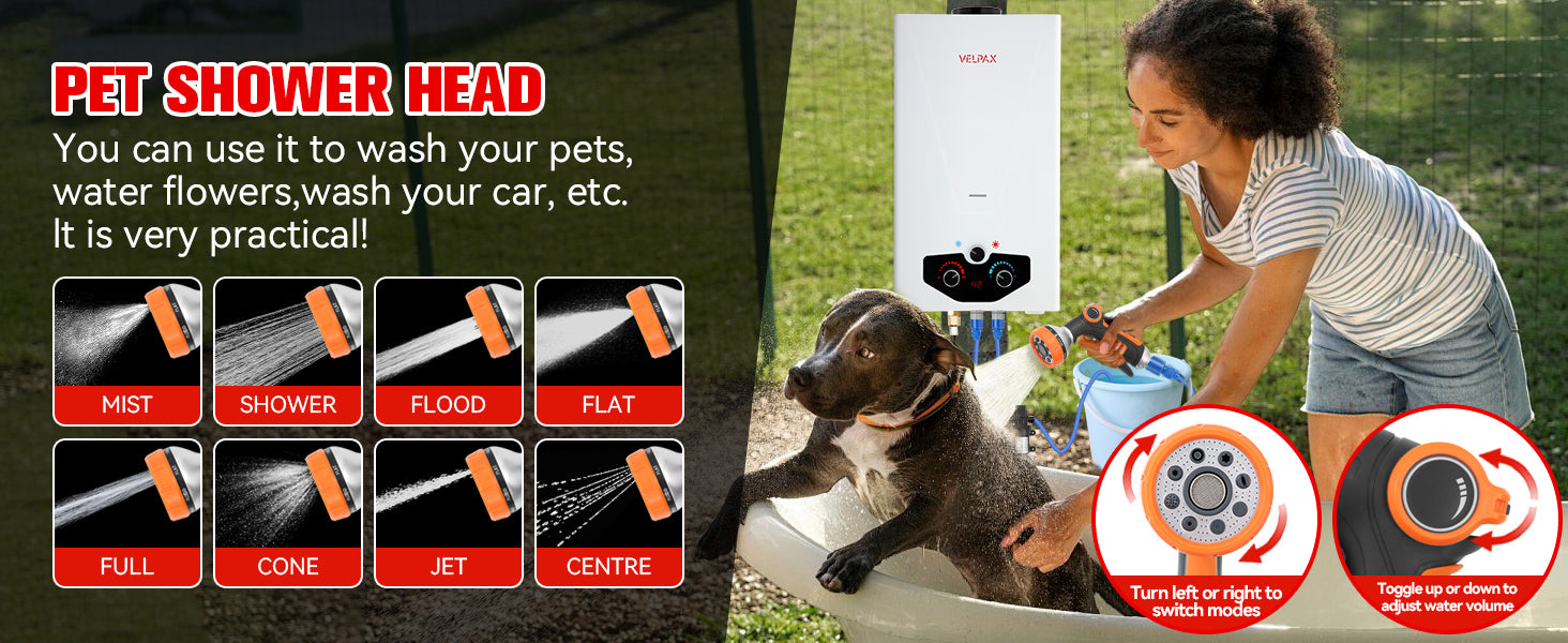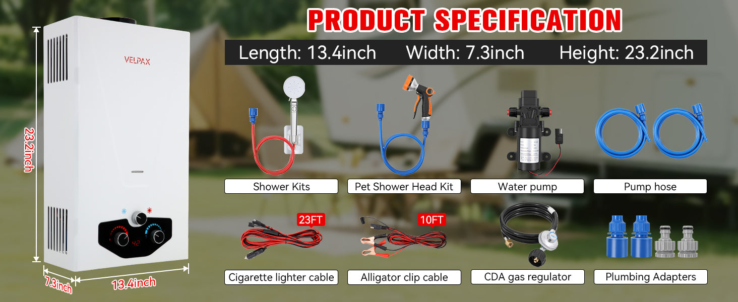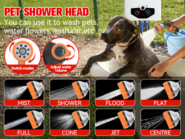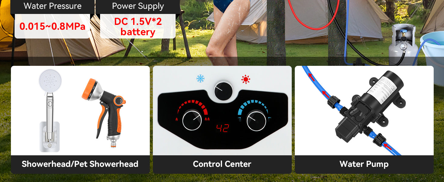 - 【Complete Accessories】 - This tankless water heater comes with a CSA-approved 5FT gas regulator and a high-pressure shower head with 5 spray modes. Also included are a 8 spray pet showerhead, a 2GPM water pump with dual power options (10ft alligator clip cable and 23ft cigarette lighter cable), 4 pipe adapters, and 2 hoses. The dual power options for the water pump allow for flexible charging and usage, whether you're near a vehicle or using a battery setup.