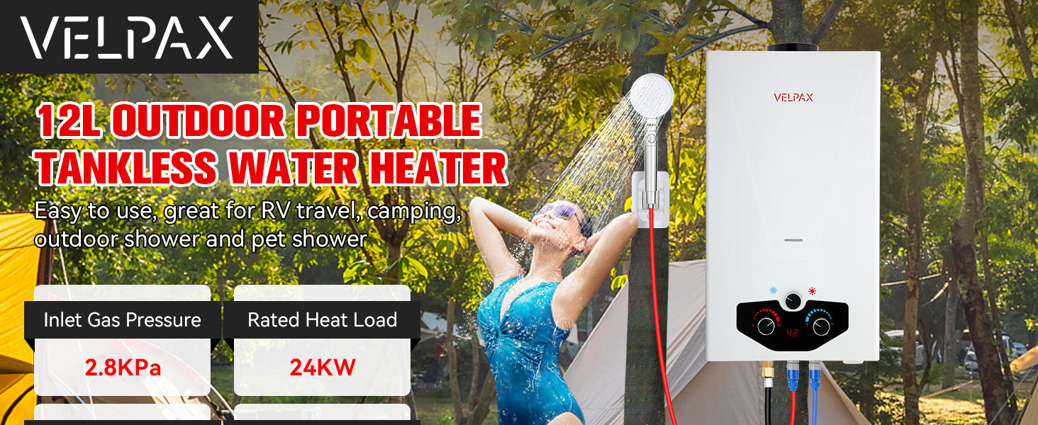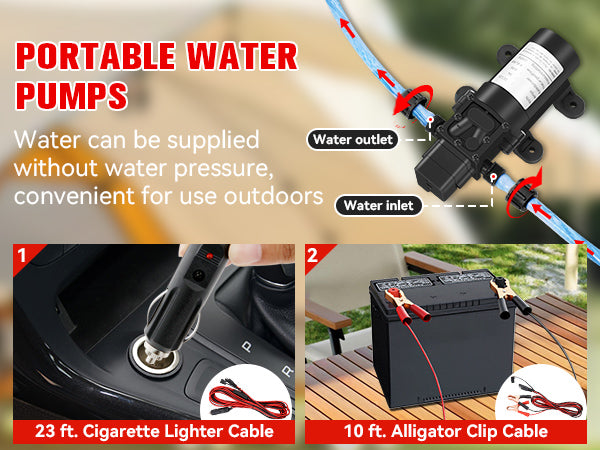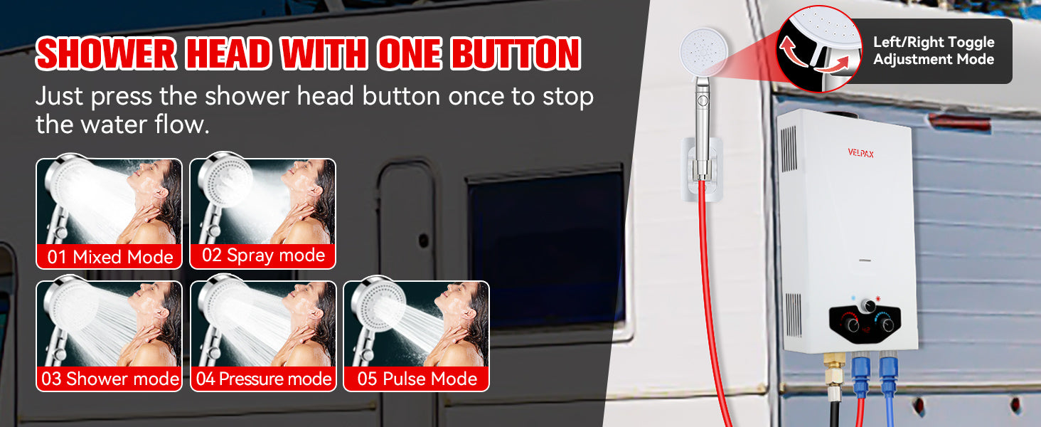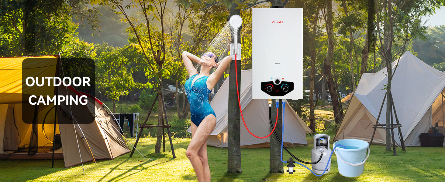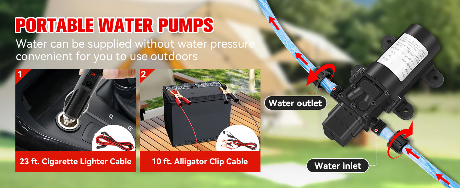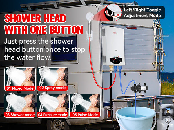 - 【Complete Accessories】 - This tankless water heater comes with a CSA-approved 5FT gas regulator and a high-pressure shower head with 5 spray modes. Also included are a 8 spray pet showerhead, a 2GPM water pump with dual power options (10ft alligator clip cable and 23ft cigarette lighter cable), 4 pipe adapters, and 2 hoses. The dual power options for the water pump allow for flexible charging and usage, whether you're near a vehicle or using a battery setup.