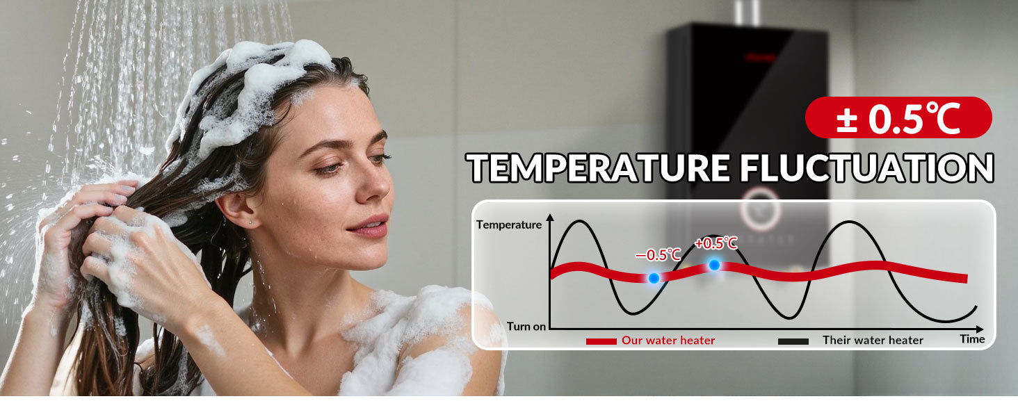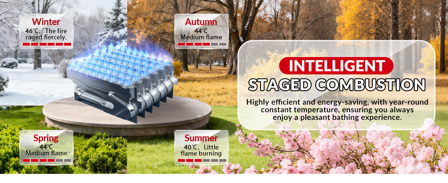 - 【Quality Material】- Our Natural Gas Water Heater has a tempered glass panel, which offers good high-temperature and corrosion resistance—ideal for humid indoor areas like bathrooms. It also comes with a built-in oxygen-free copper water tank that reduces heat loss (keeping hot water warm longer) and extends the heater’s service life. Plus, it’s equipped with an LED smart digital display, so you can easily adjust the temperature between 38°C - 75°C for different needs, like showers or washing dishes.