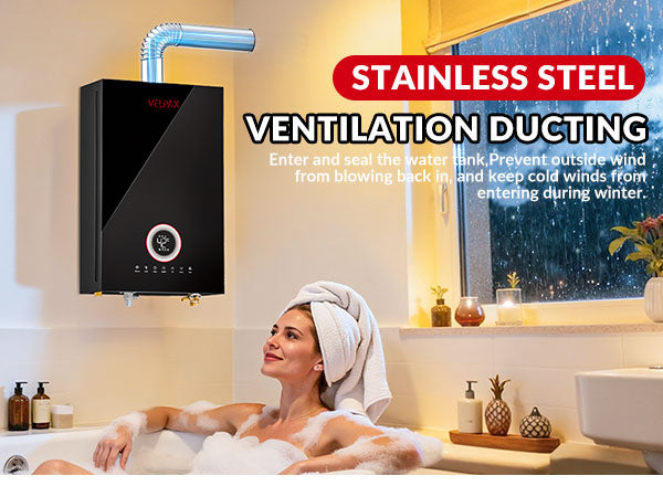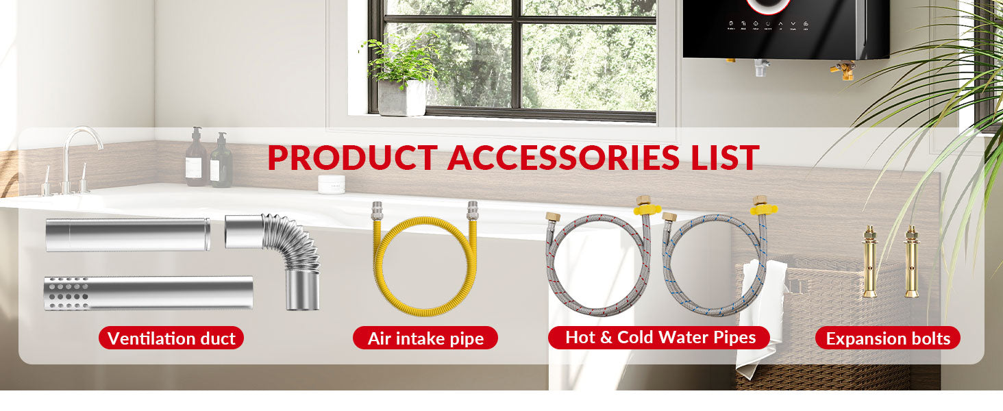 - 【Easy Assemble and Use】- This water heater is applied with standard 1/2" NPT water fittings and gas inlet, and comes with a 2.4" horizontal vent pipe for quick installation. Note: For normal operation, this product must be installed with proper ventilation and equipped with a smoke exhaust pipe.