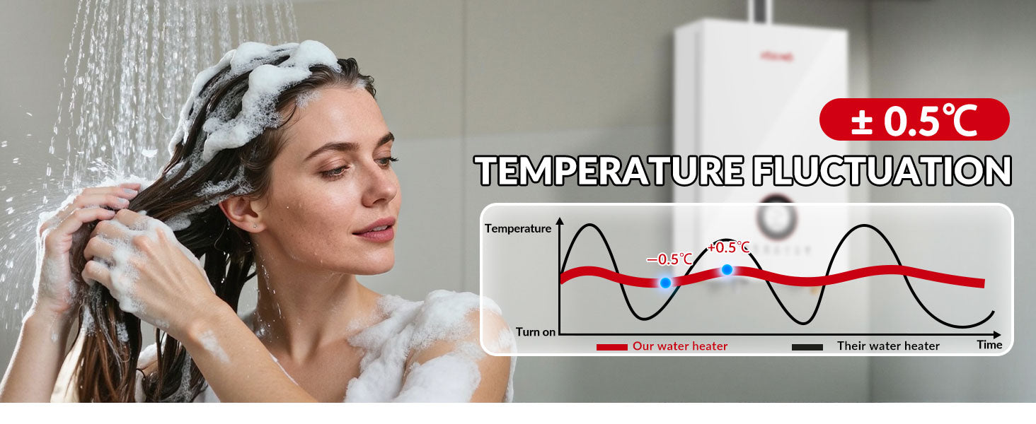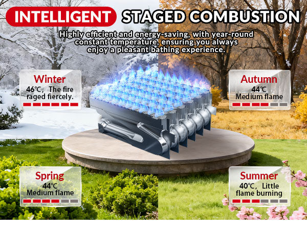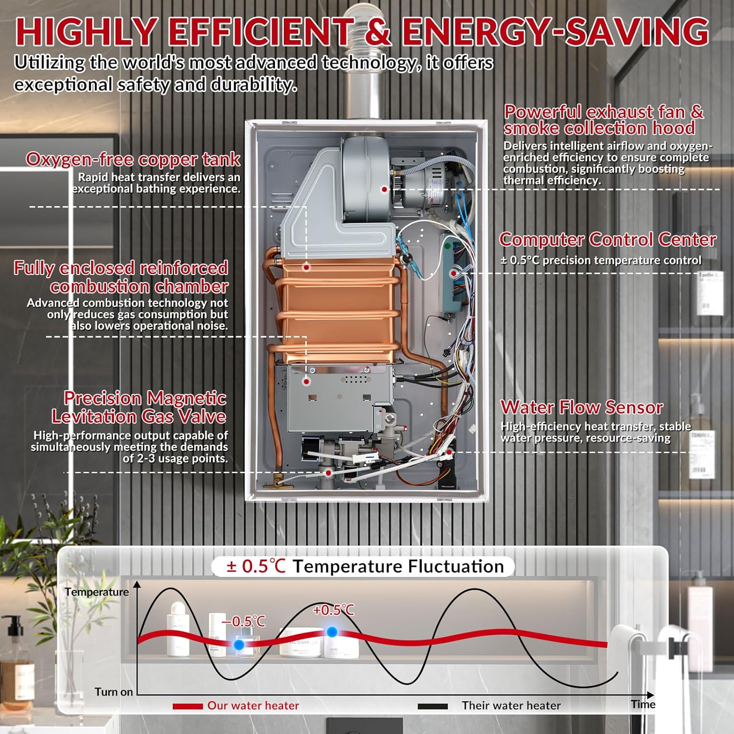 - 【Quality Material】- Our Natural Gas Water Heater has a tempered glass panel, which offers good high-temperature and corrosion resistance—ideal for humid indoor areas like bathrooms. It also comes with a built-in oxygen-free copper water tank that reduces heat loss (keeping hot water warm longer) and extends the heater’s service life. Plus, it’s equipped with an LED smart digital display, so you can easily adjust the temperature between 38°C - 75°C for different needs, like showers or washing dishes.