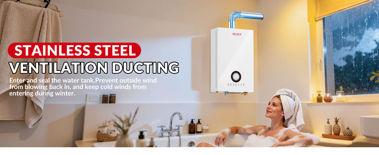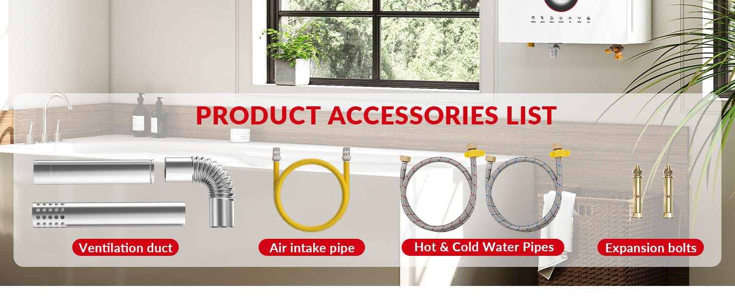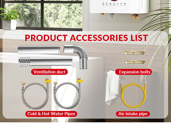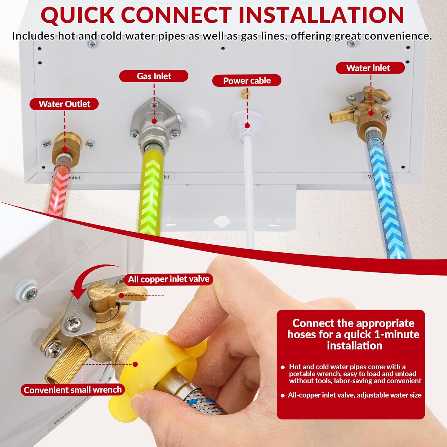 - 【Easy Assemble and Use】- This water heater is applied with standard 1/2" NPT water fittings and gas inlet, and comes with a 2.4" horizontal vent pipe for quick installation. Note: For normal operation, this product must be installed with proper ventilation and equipped with a smoke exhaust pipe.